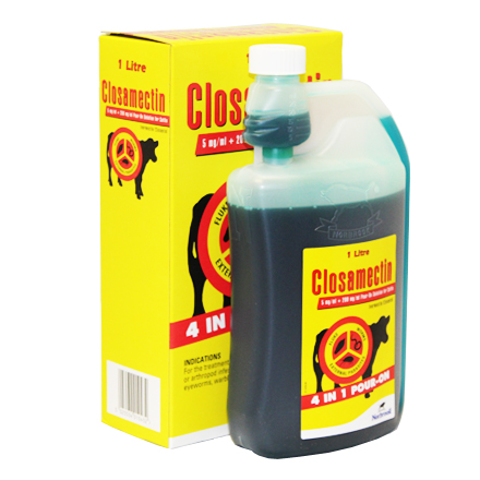 Closamectin is a pour-on solution that is used to coltrol fluke or arthropod infestations in cattle and sheep due to longworms, roundworms, eyeworms, mites, lice and warbles. Closamectin is an effective solution and easier compared to drenches or injections. Closamectin is available in 500ml or 1L.